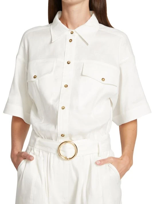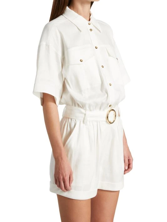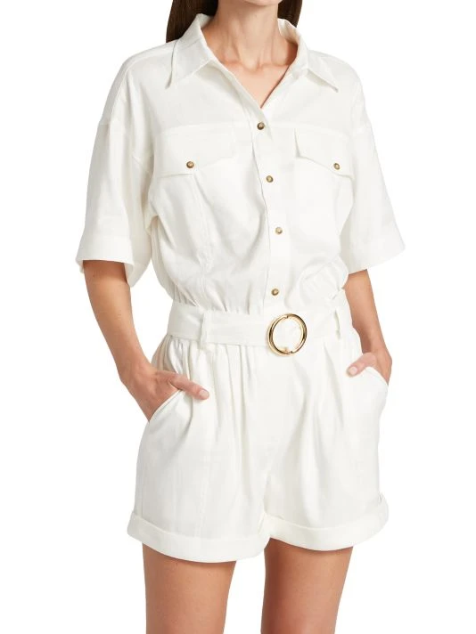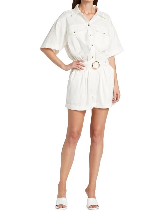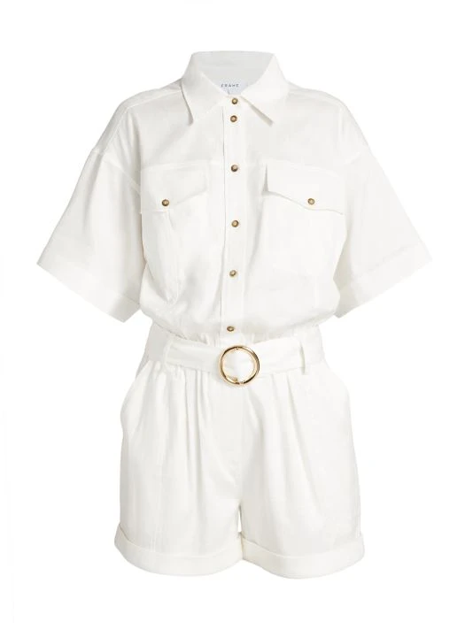 This romper is designed with a short-sleeve button top and pleated shorts.