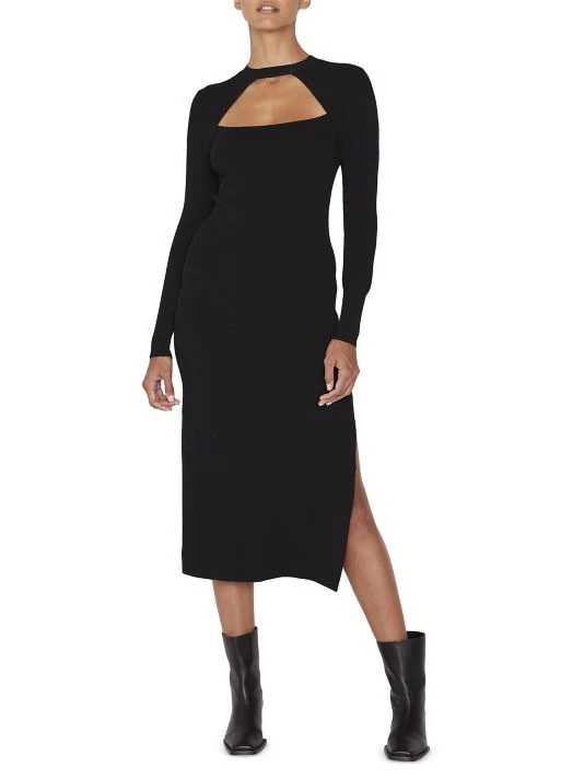 Pullover sweater midi-dress with a geometric chest cut-out and sleek side slit.