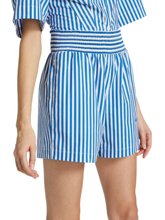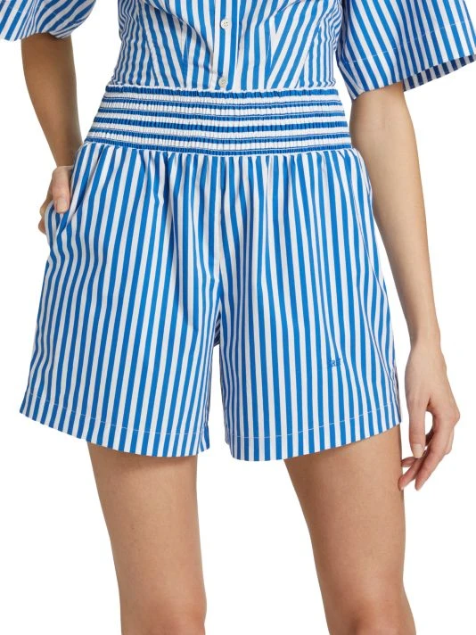 These Frame high-waisted striped shorts feature a classic stripe pattern and an easy pull-on waistband. The style is finished with side seam pockets and the brand’s embroidered initial monogram at the left thigh.