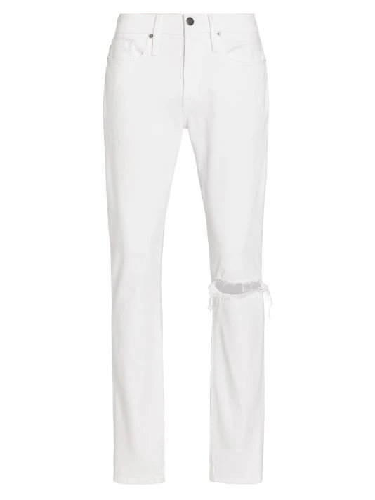 These skinny jeans in a five-pocket silhouette feature a distressed accent at the knee.