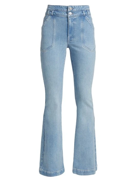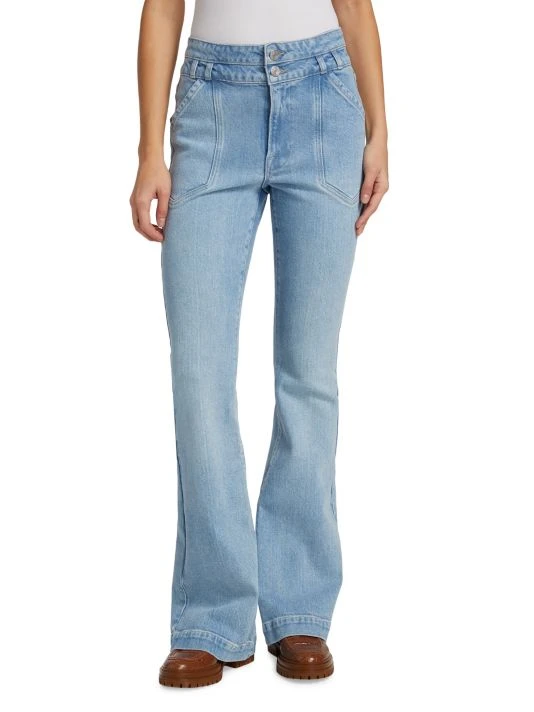 Cut in a flared-leg silhouette, these mid-rise jeans offer a double-button waist and defining front slash pockets.