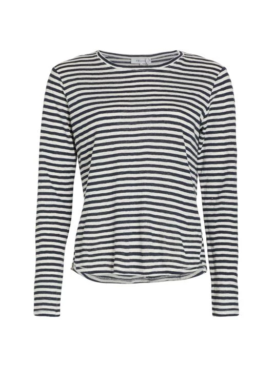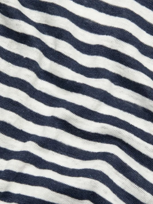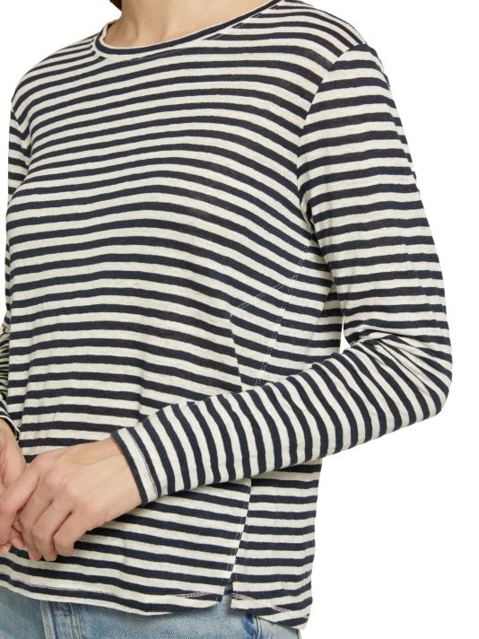 Crafted of soft linen, this minimalist crewneck top is enhanced with an eye-catching stripe.