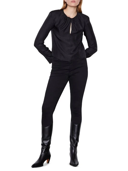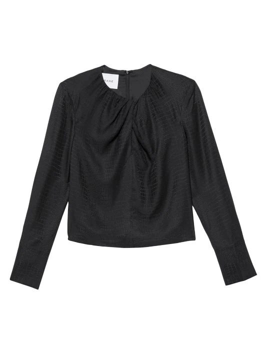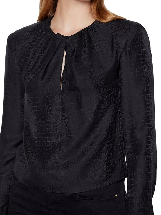 Twisted neck blouse with animal-inspired embossed patterning and a keyhole chest cut-out.