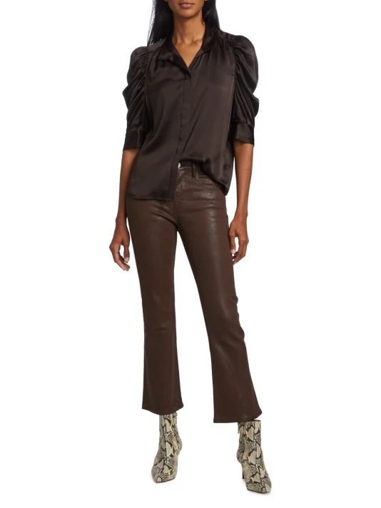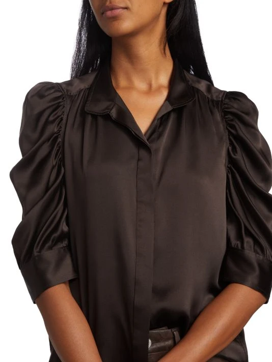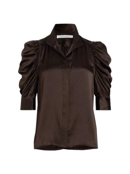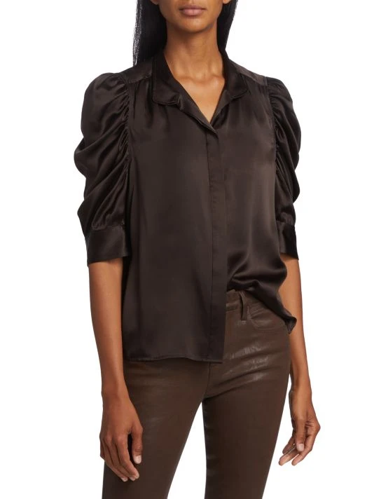 Ruched puff sleeves lend style to Frame’s Gillian top, cut from luminous silk.