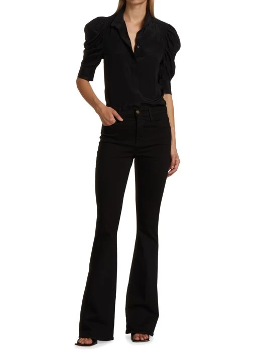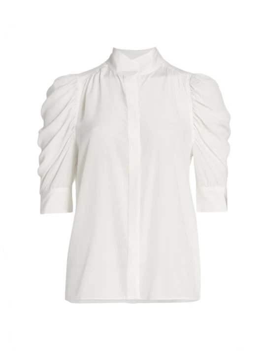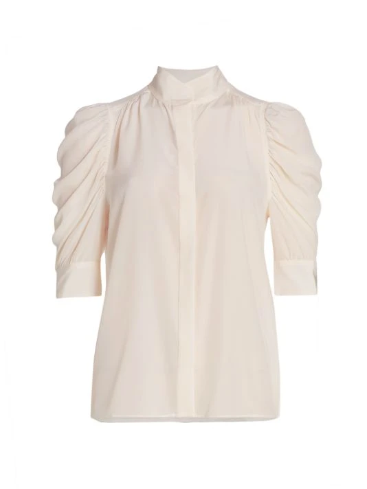 Luxe silk top features dramatic puff-sleeves and mock neck in a satin finish.