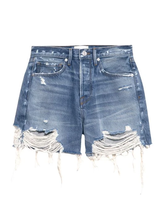 The High-Rise Vintage denim shorts from Frame are finished with a raw-edge hem and distressed details.