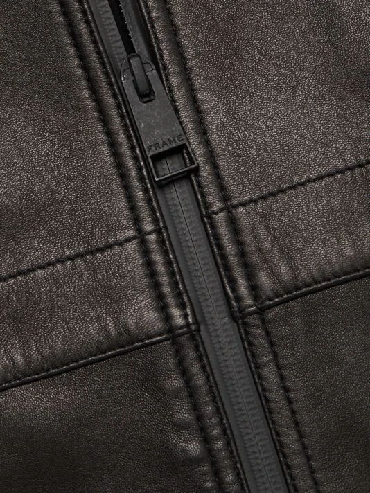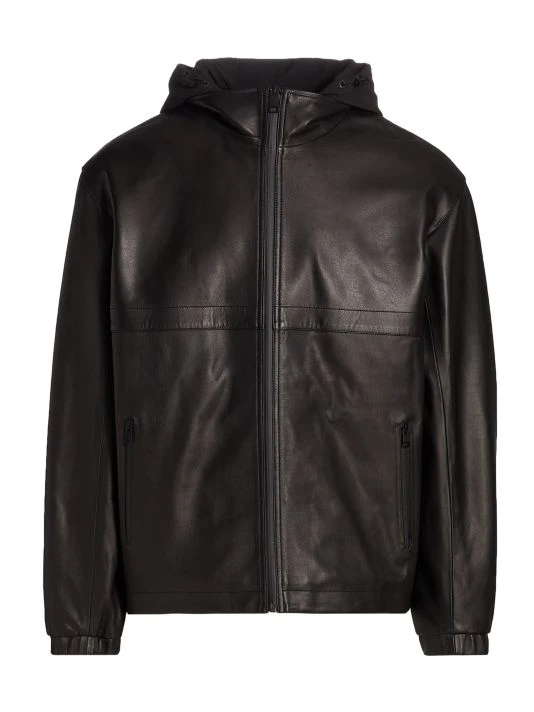 This sleek hooded jacket is crafted of sumptuous lambskin leather and features are drawcord hood.
