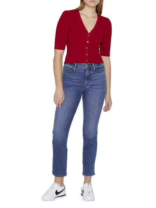Short sleeve rib-knit cardigan in a cropped silhouette.