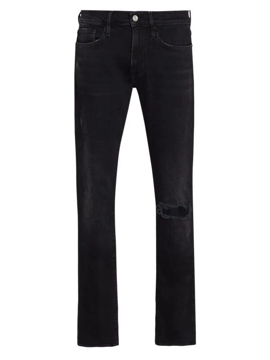 These slim-fit jeans are in a five-pocket silhouette designed with an intentionally faded finish and a distressed accent on the front.