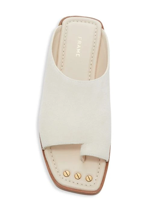 Sleek square-toe slides with a unique toe-ring detail for a modern twist in a rich suede.