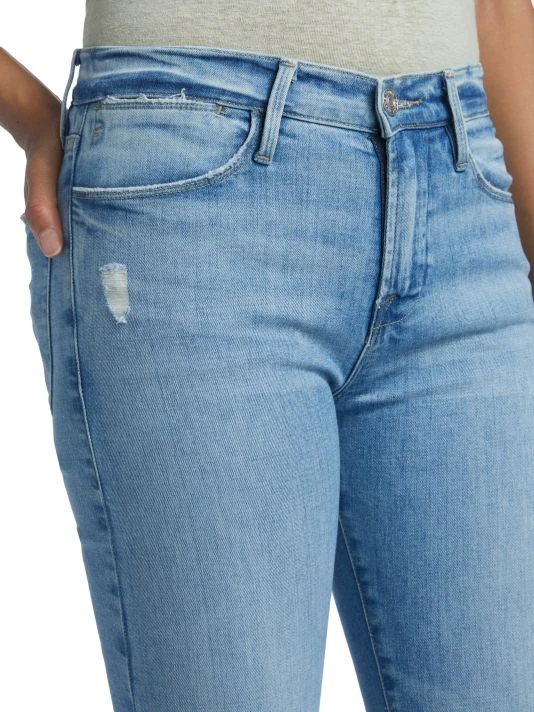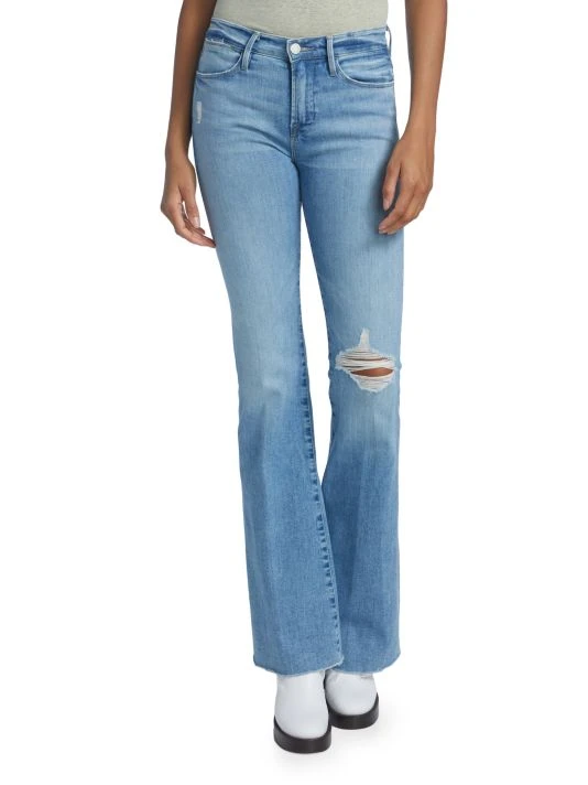 Cut in a flared silhouette, these high-rise jeans feature distressing at knee and a raw hem.