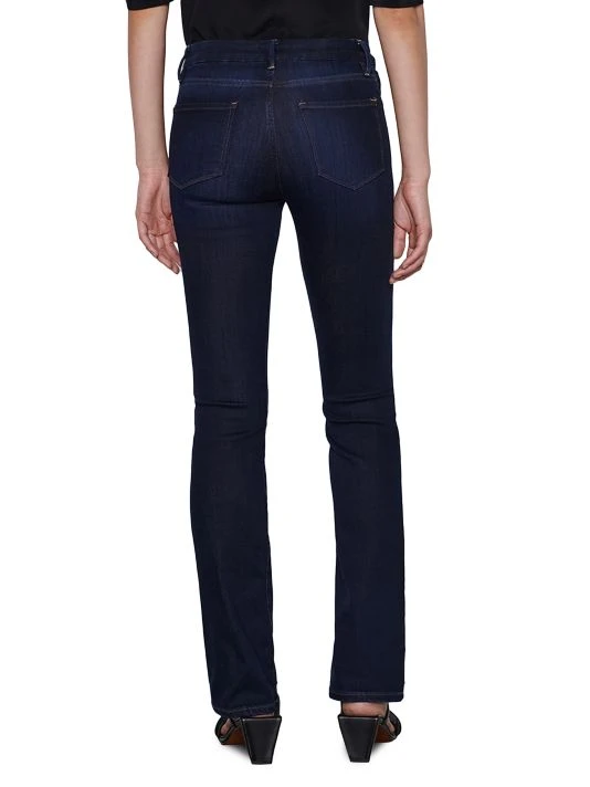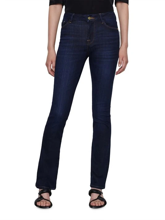 Fitted jeans cut with a traditional bootcut style, features whiskering at the thighs that carry down to the legs.