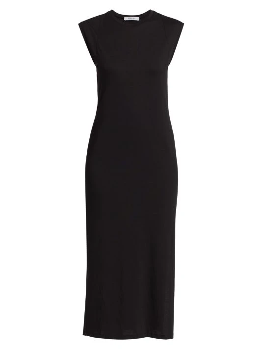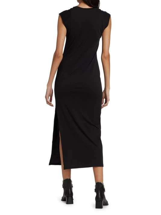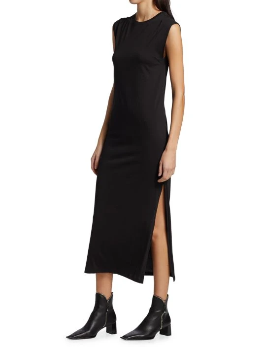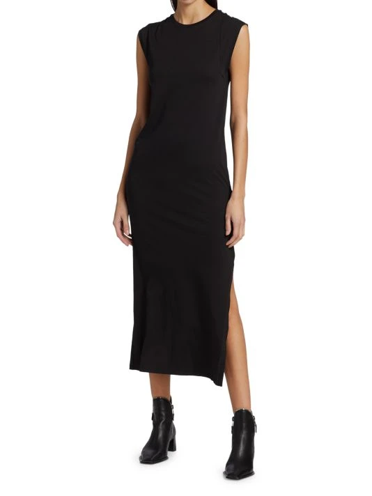 Soft organic Pima cotton sleeveless muscle tee dress falls to a midi side slit hem.