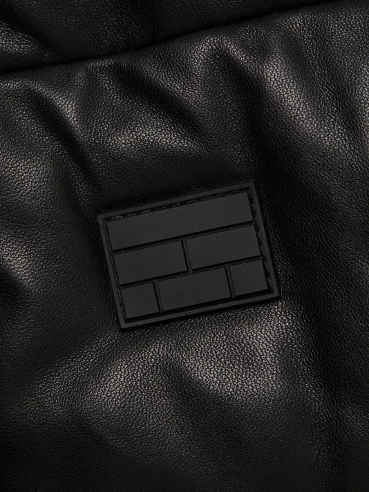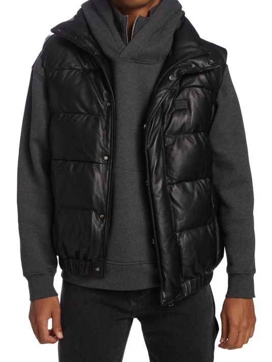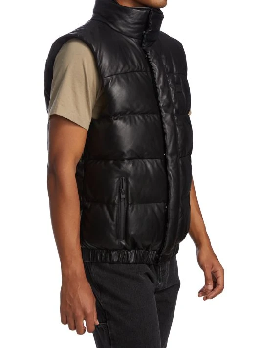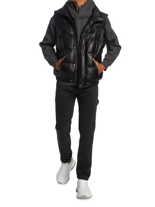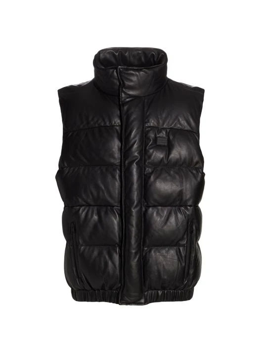 A quilted leather puffer vest detailed with a logo patch and cinched hem.