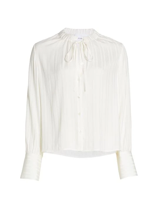 This elegant blouse is crafted of shirred silk and features a tie-accented crewneck.