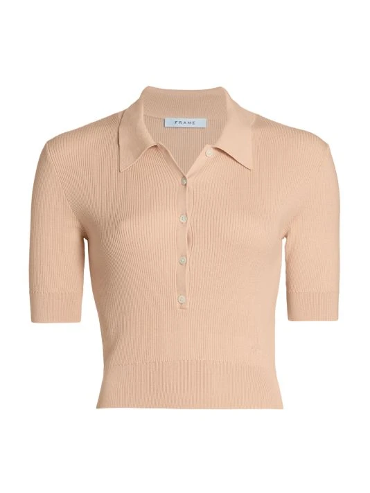 Frame’s short-sleeve polo is crafted of a luxe silk and cotton blend. This sweater is designed in a rib-knit with a point collar.
