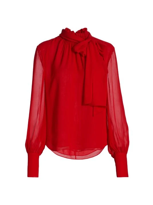 Crafted of silk, this blouse features a bow detail at the neck, and sheer puff-sleeves.