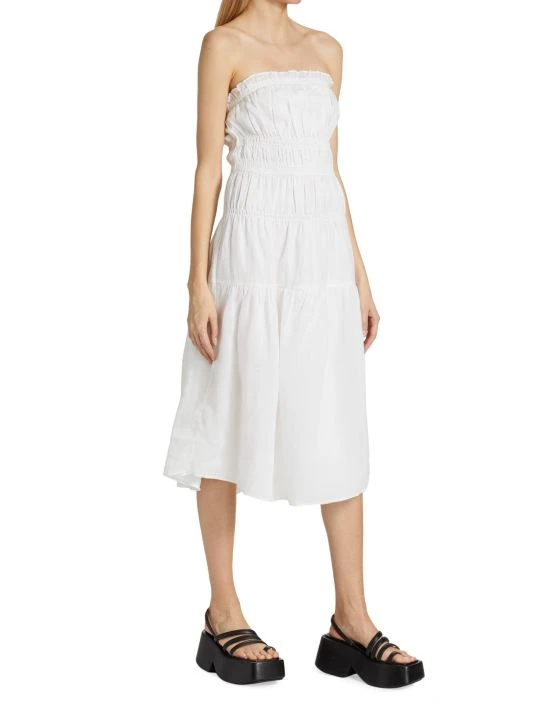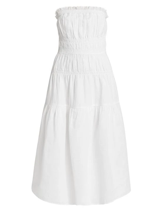 Frame’s strapless dress is crafted of a light and airy fabric. This midi style features smocking with a tiered skirt.