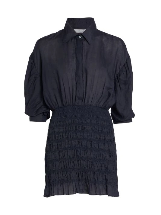 Frame’s shirtdress is effortlessly lightweight. This mini style is designed with a smocked skirt and elbow sleeves.