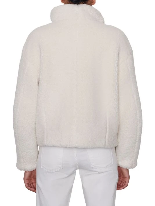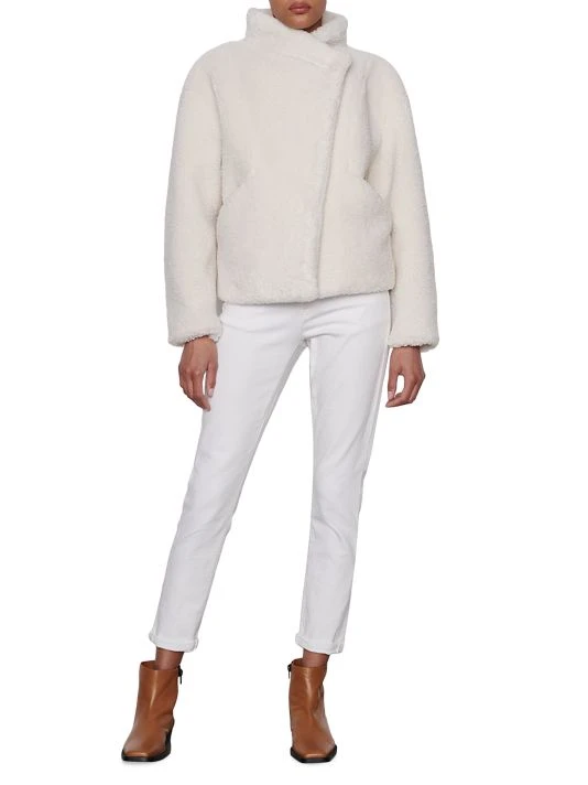 Teddy textured jacket with modern asymmetric snap closure, featuring a mock neckline and side slit pockets.