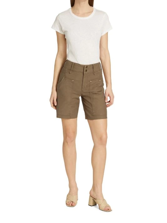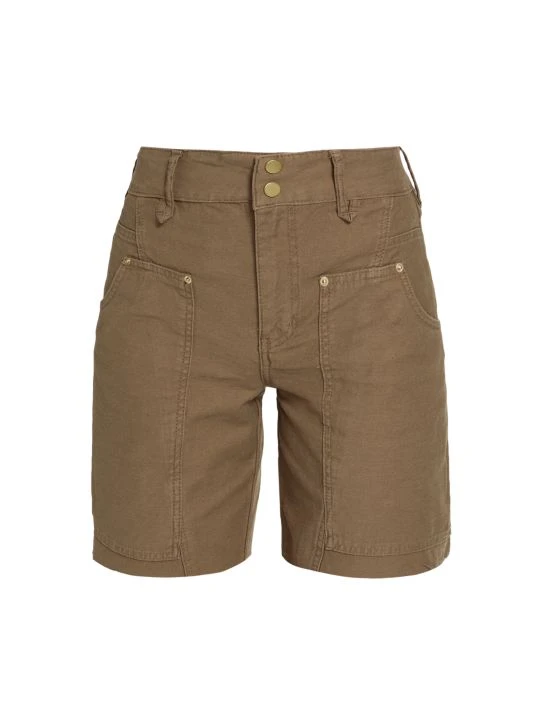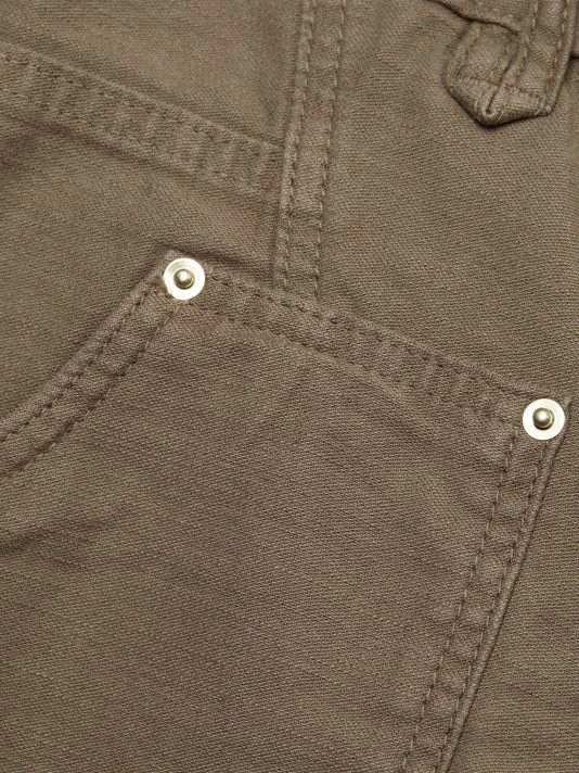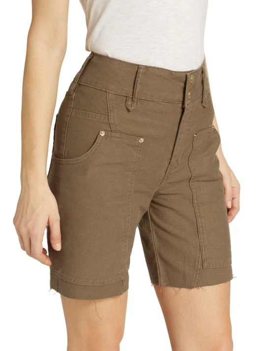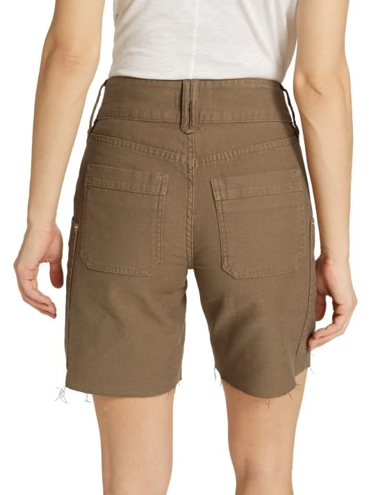 The Twisted utility short is made of dyed denim with utility pockets and raw hems.