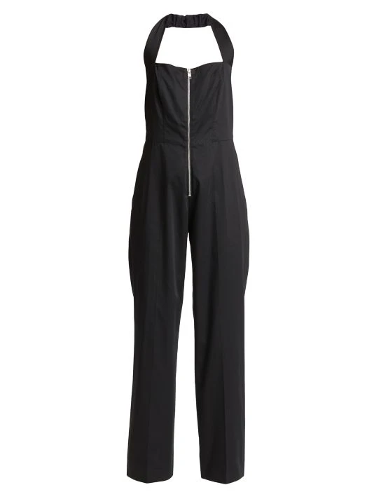 This jumpsuit is made of stretch-cotton with a halter neck and full-zipper front.